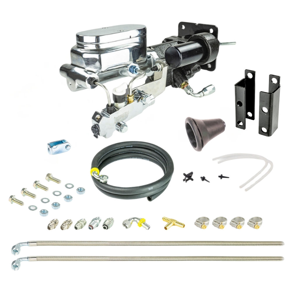 Description1955-58 Full Size Chevy Black Hydro Boost & Master Cylinder Combination Kit with Stainless Hoses Disc/Disc