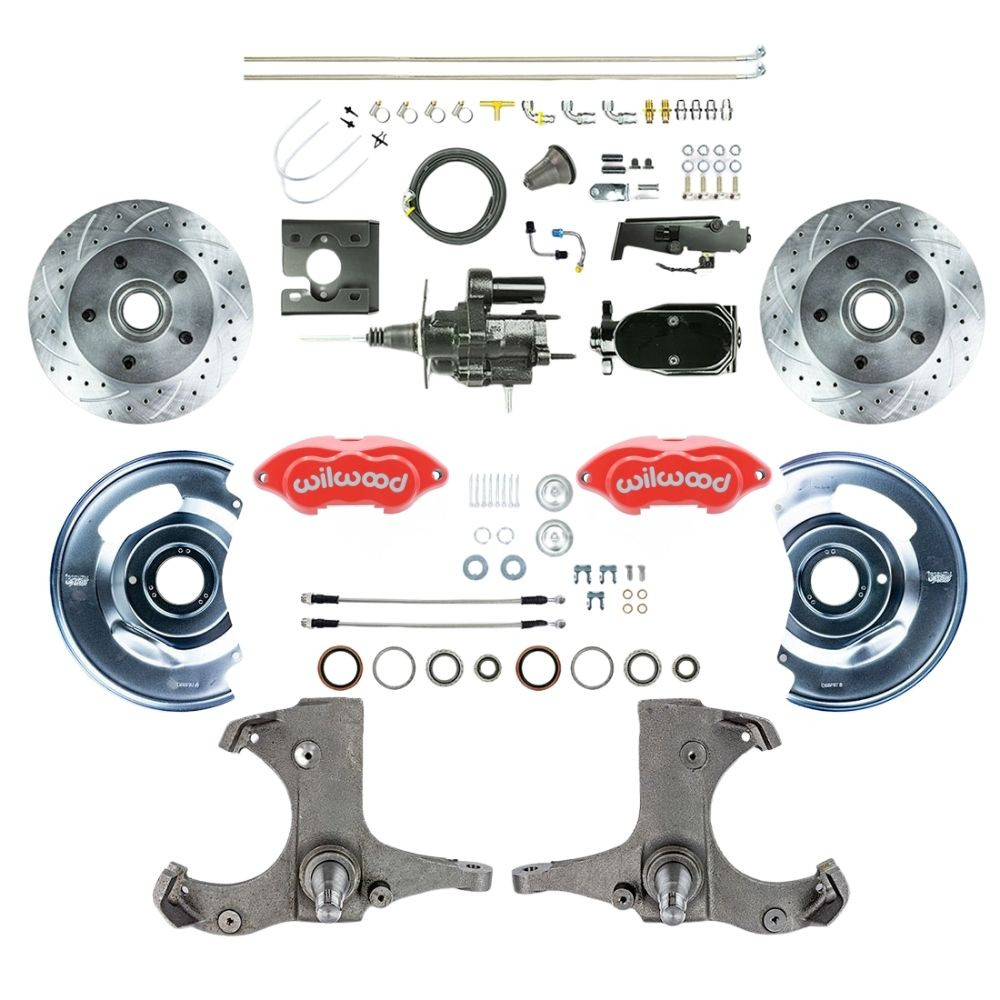 Description1967-70 GM C10/C15 Truck/Suburban with 2WD, Performance Series Hydraulic Brake Assist Front Disc Kit, Red Wilwood Calipers, Drilled and Slotted Rotors, Braided Stainless Hoses, and Black Upper Assembly 5x5 Bolt Pattern