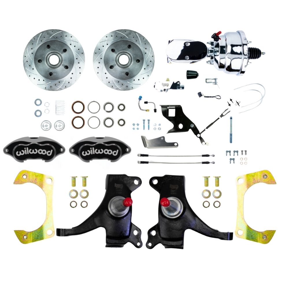 Description1971-72 GM C10/15 Truck/Suburban, 2" Drop Performance Series Power Front Disc Brake Kit with Black Wilwood Calipers, Drilled and Slotted Rotors, Braided Stainless Hoses, and Chrome Booster Master Assembly