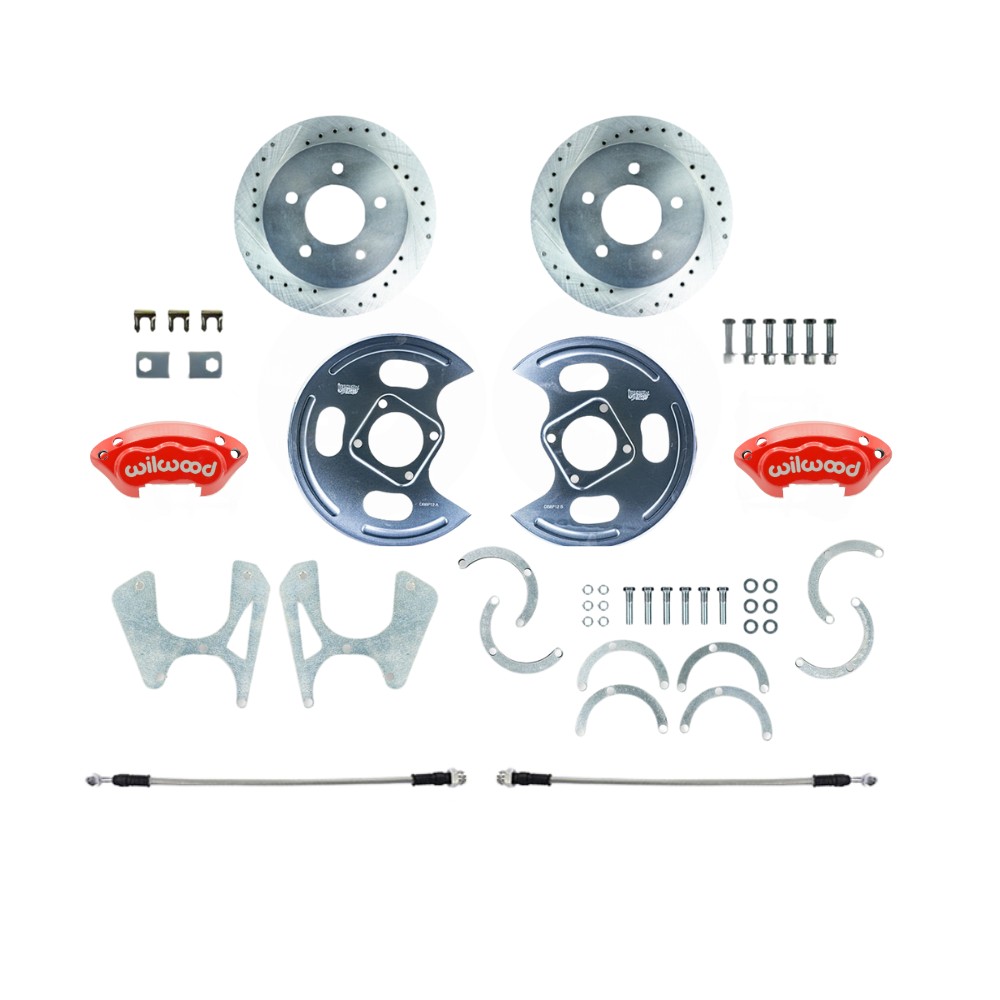 Description1973-1987 Chevy/GMC Truck Performance Series Rear Disc Brake Conversion Kit, with Red Wilwood Calipers, Drilled and Slotted Rotors, Backing Plates and E-brake Cables, 5 Lug