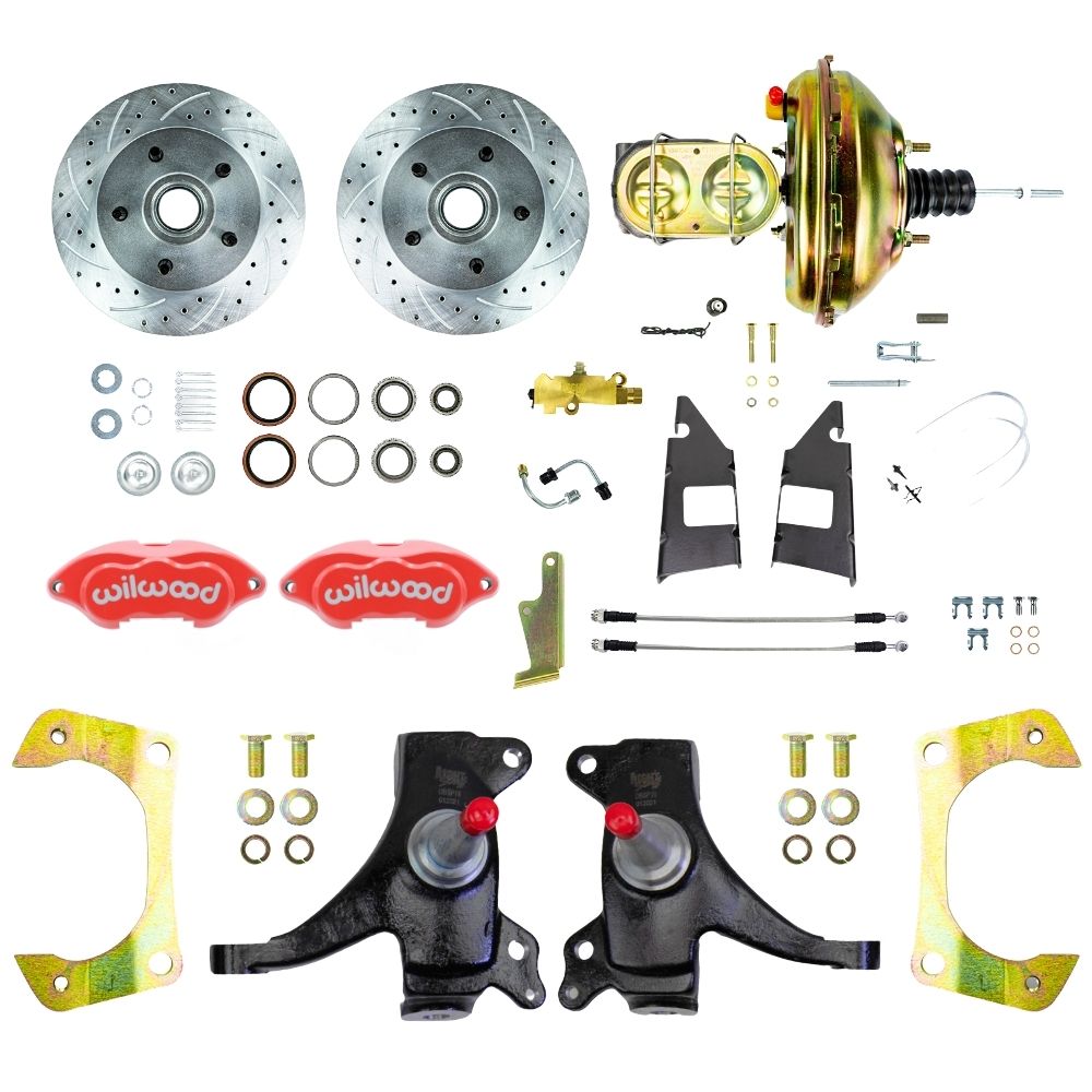 Description1973-87 GM C10/C15 Truck/Suburban, 2WD, 2" Drop Performance Series Power Front Disc Brake Kit, with Red Wilwood Calipers, Drilled and Slotted Rotors, and Braided Stainless Hoses
