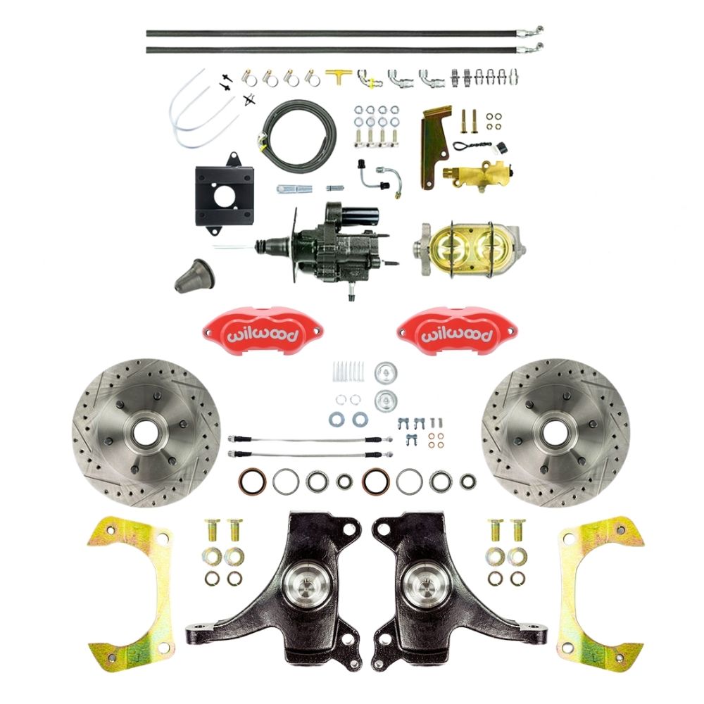 Description1960-62 Chevy/GMC Truck/Suburban Hydraulic Brake Assist Performance Series 2" Drop, Front Disc Brake Conversion Kit, Red Wilwood Calipers, Drilled and Slotted Rotors, and Braided Stainless Hoses