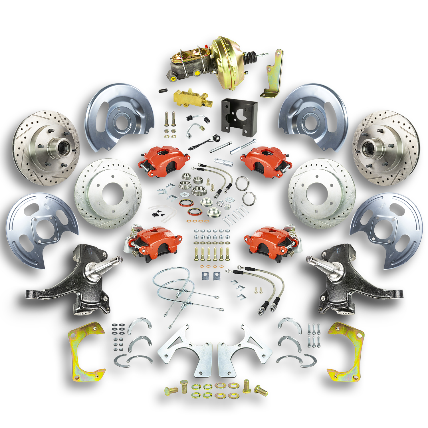 Description63-66 GM C10/C15 Truck/Suburban 2" Drop, Pwr 4-Wheel Disc Kit, Red Calipers - 6x5.5 Bolt Pattern
