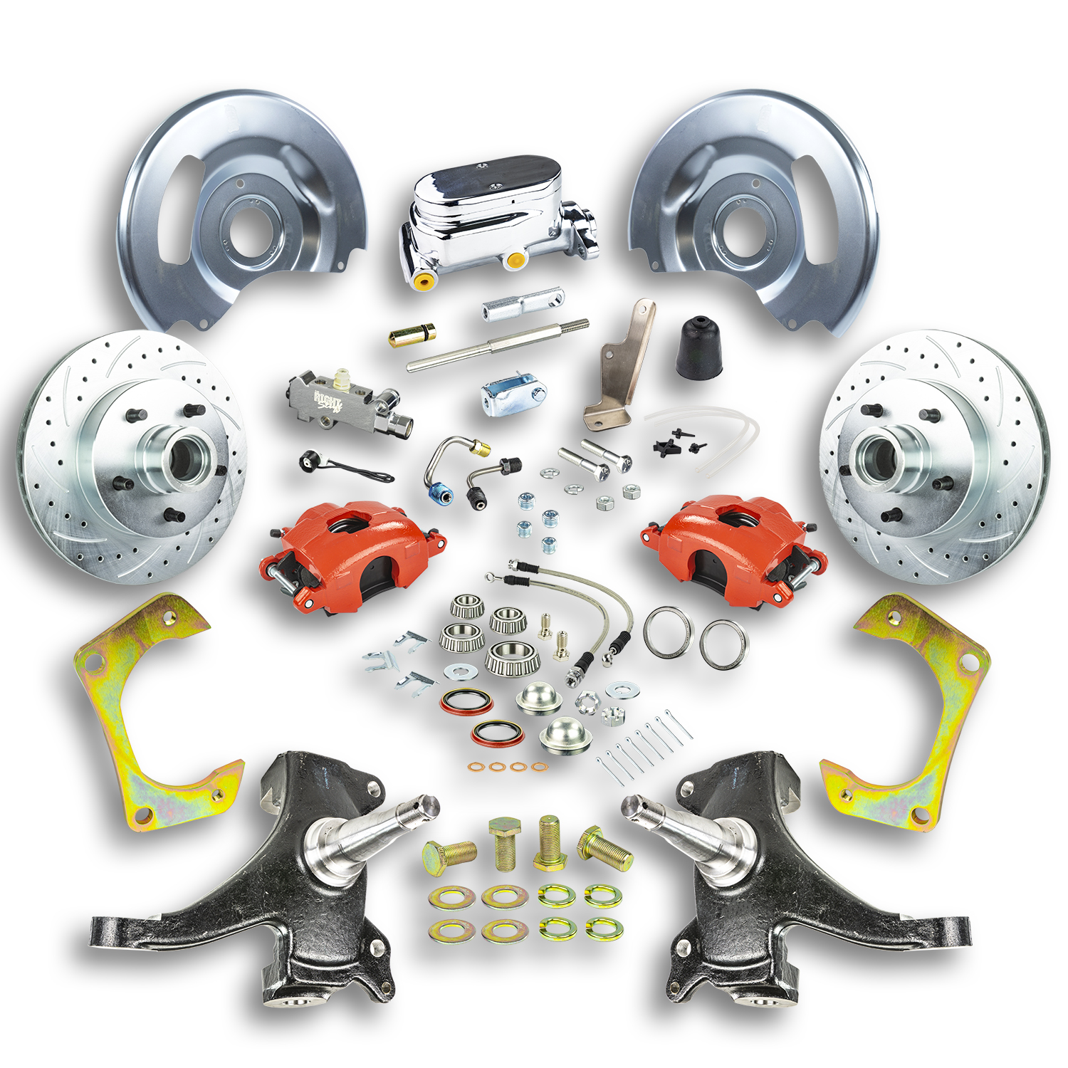 Description63-70 GM Truck & Sub, 2" Drop Std Front Disc Brake Kit Red Calipers Chrome Upper